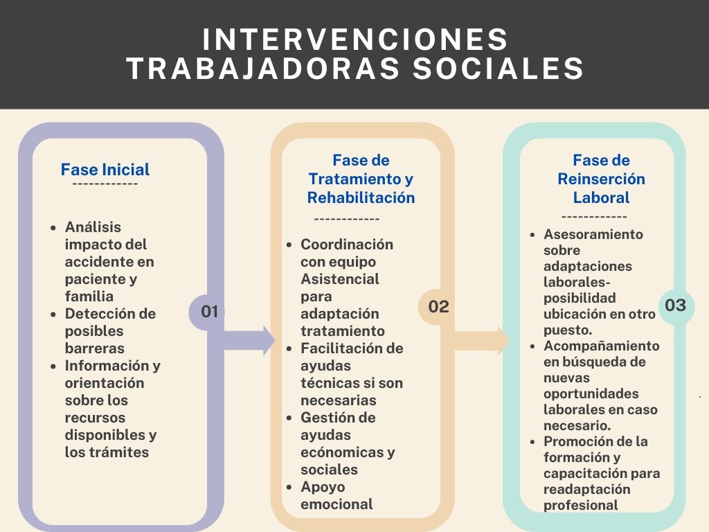 Desde el equipo de Trabajo Social de Mutua Universal desempeñamos un papel esencial en el acompañamiento de los trabajadores accidentados, brindando apoyo en todas las fases del proceso de recuperación tras un accidente laboral. Nuestra intervención no solo se centra en el paciente, sino que también abarca su entorno, promoviendo un enfoque integral que favorezca su bienestar y su reincorporación al mundo laboral.