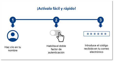 El doble factor de autenticación añade una capa adicional de seguridad al inicio de la sesión. Es una medida de seguridad que requiere dos pasos para acceder a un sistema: primero tu contraseña y luego una validación en un elemento de confianza, como un código que recibes en tu e-mail. De este modo, aunque alguien conozca tu contraseña, no podrá entrar sin ese segundo paso. Esta protección extra es muy eficaz para evitar accesos no autorizados.