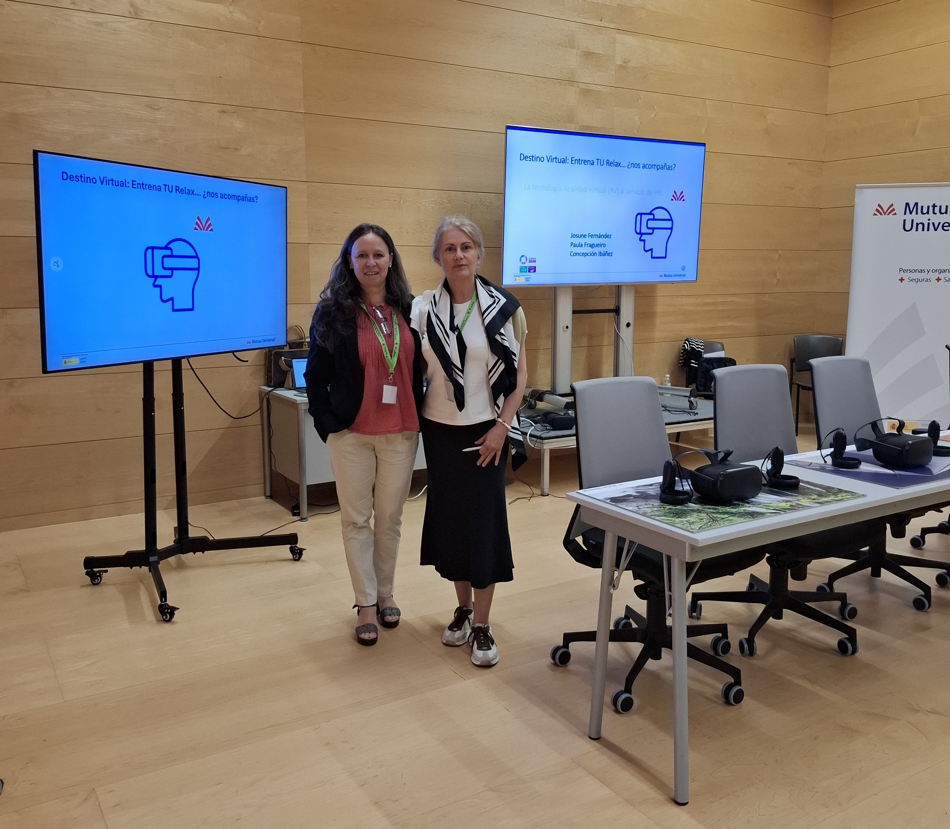 Durante el evento, Concepción Ibañez García y Paula Fragueiro Barros, técnicas de psicología, presentaron la iniciativa «EntrenaTURelax» de Mutua Universal, una experiencia inmersiva de entrenamiento de técnicas para mejorar la gestión del estrés a través de la realidad virtual.