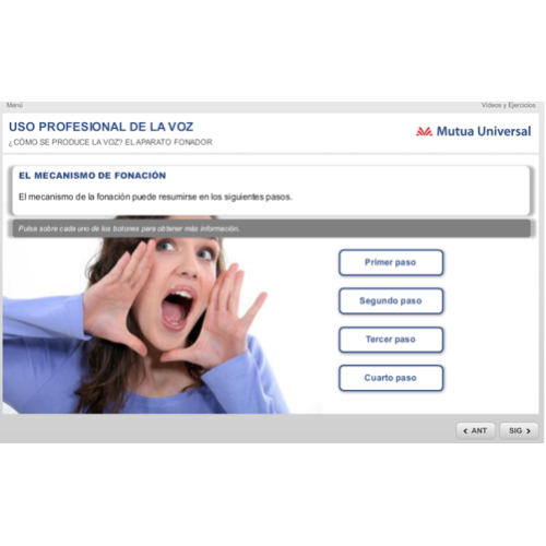 El curso es exclusivo para asociados y asociadas a Mutua Universal y tiene como objetivo explicar los riesgos en el uso inadecuado de la voz y las medidas preventivas para evitarlos. Se accede a través del Campus Virtual de Prevención de Mutua Universal.