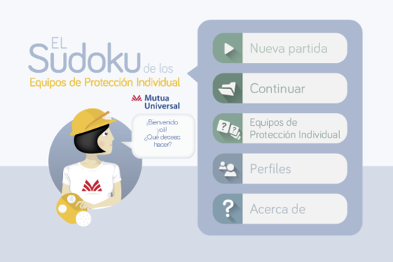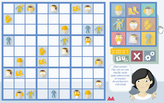 - Tablero de juego: consta de las casillas para rellenar y los iconos de Equipos de Protección Individual para seleccionar y colocar en las casillas pertinentes, siguiendo las mismas reglas que un Sudoku numérico.