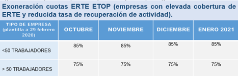 Aplicable a empresas de cualquier sector o actividad que vean impedida el desarrollo de su actividad en algunos de sus centros de trabajo, como consecuencia de las nuevas restricciones o medidas de contención sanitarias adoptadas a partir del 01.10.2020, previa autorización de un expediente de regulación temporal de empleo.