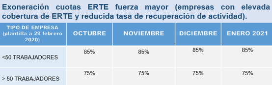Expedientes de regulación temporal de mpleo por fuerza mayor con exoneraciones: para aquellas empresas cuya actividad está encuadrada dentro de las 42 actividades que recoge el anexo del Real Decreto Ley 30/ 2020, de 29 septiembre, o son integrantes de la cadena de valor o dependientes indirectamente de las empresa cuya Clasificación Nacional de Actividades Económicas (CNAE) se considera como actividad de elevada tasa de cobertura por los ERTE y reducida tasa de recuperación de actividad.
