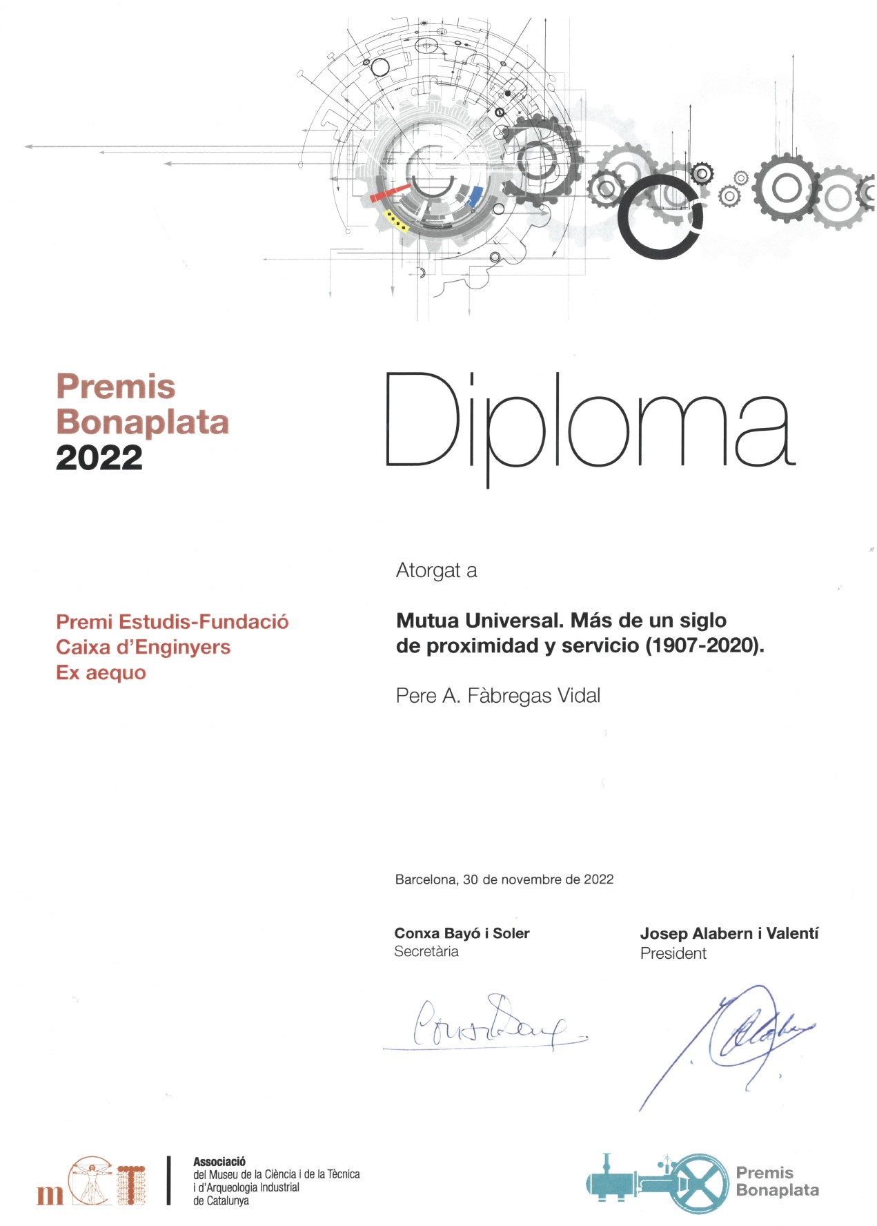 El libro ‘Mutua Universal. Más de un siglo de proximidad y servicio (1907-2020)’ escrito por el historiador Pere A. Fàbregas ha resultado ganador ex aequo en la 30ª edición de los Premis Bonaplata 2022 en la categoría Premi Estudis que convoca la Associació del Museu de la Ciència i de la Tècnica i d’Arqueologia Industrial de Catalunya.